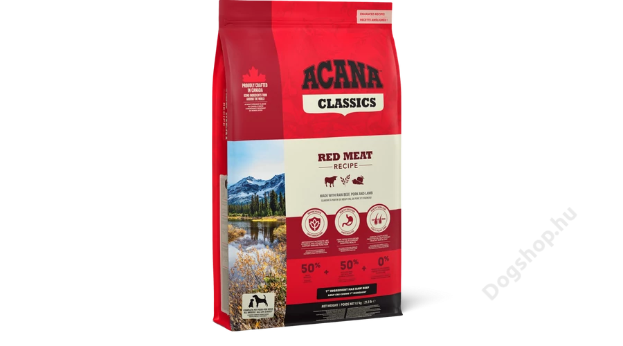 A modern kutyák nemcsak képesek megenni őseik táplálékát, hanem szükségük is van rá a kiváló egészségi állapot fenntartásához. Pontosan ezért készül az ACANA Red Meat nyers* marhából, dehidratált bárányból, és nyers* sertésből. Semmi csirke vagy bármiféle baromfiszármazék, csak kizárólag vörös húsok. Az ACANA Red Meat alacsony glikémiás gyöngyárpát, borsót és zabot tartalmaz, ezért a vércukor szintje stabil marad, csökkentve az elhízás kockázatát.