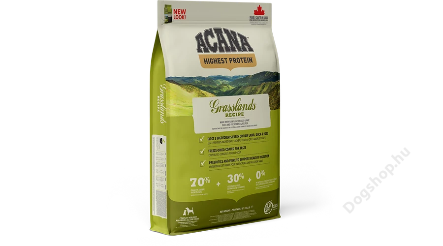 Az ACANA Grasslands a húsok mellet tartalmaz belsőségeket és porcokat is, megfelelve az EgészPréda táplálási koncepciónak, így a tápanyagokat döntően természetes formában kapja meg a kutya, ezért radikálisan csökkenthető a felhasznált táplálék-kiegészítők száma.