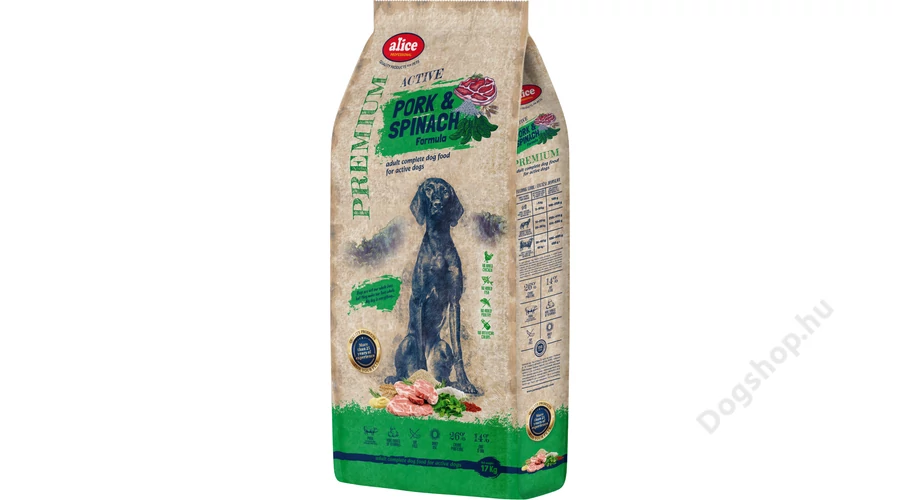 Az Alice Premium Adult Active Pork & Spinach egy teljes értékű csirkementes eledel magas aktivitású felnőtt kutyák számára. Ideális választás magas aktivitású sport vagy munkakutyák részére. A táp alapját a tápláló és energiában gazdag sertéshús alkotja, melyet spenóttal fűszereztek. Vitaminokban és ásványi anyagokban gazdag eledel, így támogatva a szív- és érrendszert, valamint az általános egészséget. Ideális választás csirkefehérje allergiával küzdő kutyusok számára.