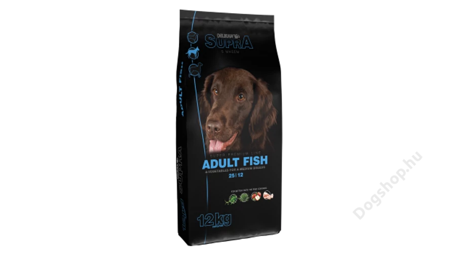 Supra Adult Sea Fish & Fresh Meat teljes értékű szuperprémium tengeri halas és friss húsos eledel felnőtt kutyák számára.