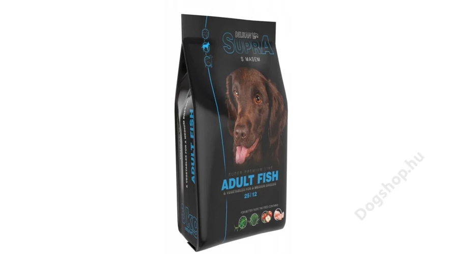 Supra Adult Sea Fish & Fresh Meat teljes értékű szuperprémium tengeri halas és friss húsos eledel felnőtt kutyák számára.