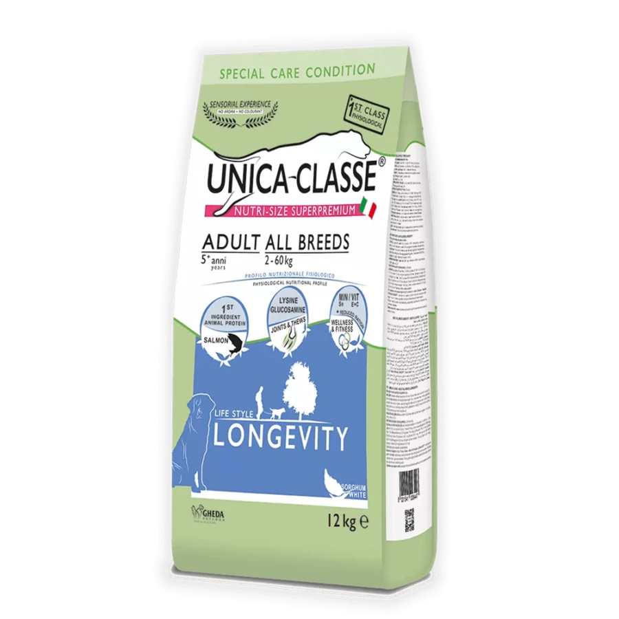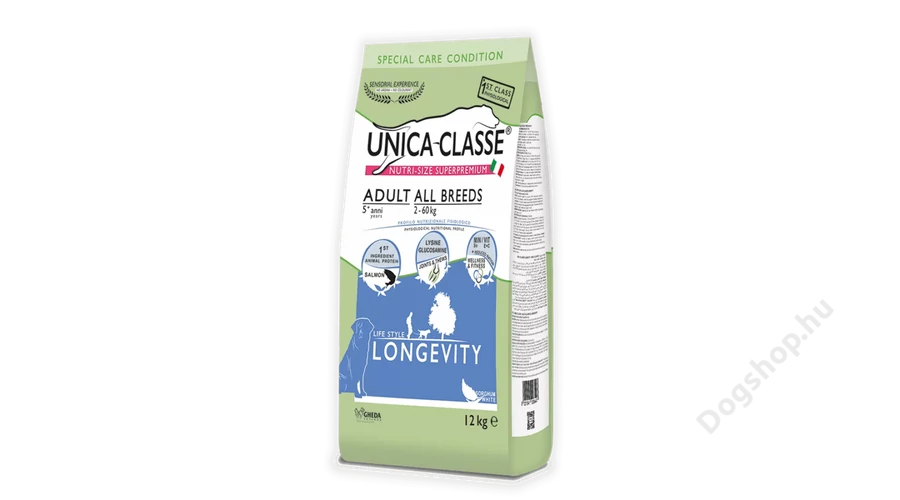 A Gheda Unica Classe Adult All Breeds Longevity egy olasz, teljes értékű, lazac ízesítésű szárazeledel minden méretű felnőtt kutya táplálására. Csökkent fizikai aktivitású, ill. súlygyarapodásra hajlamos kutyáknak kifejezetten javasoljuk.
