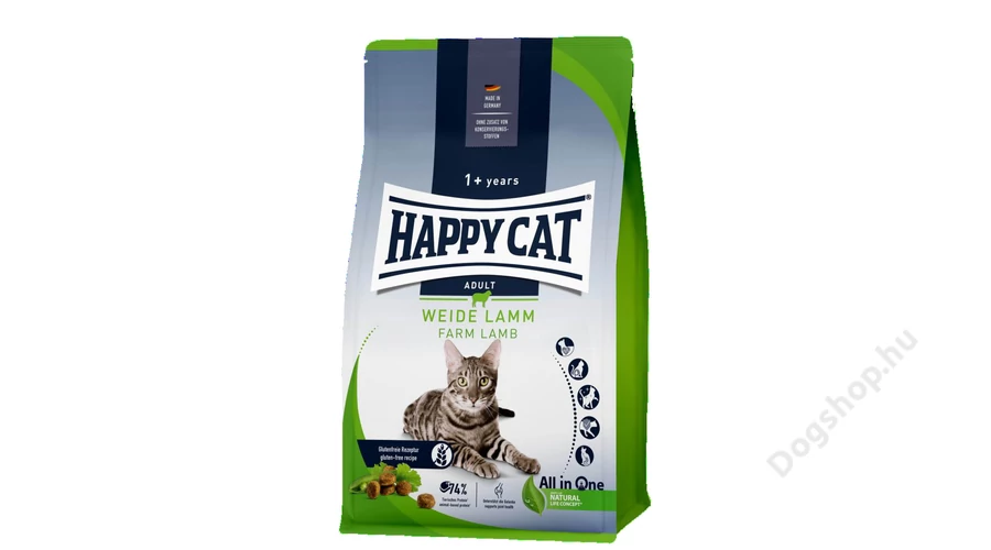 Happy Cat Supreme Adult száraz macskatáp mezei bárányból, hal-alkotóelemek nélkül, minden felnőtt macskának, érzékenyeknek is kiválóan alkalmas, Happy Cat LifePlus Concepttel, természetes taurinnal.