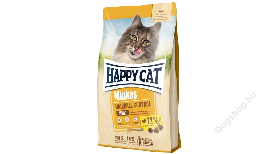 A Happy Cat Minkas Hairball Control egy teljes értékű eledel valamennyi felnőtt macska számára értékes telítetlen zsírsavakkal, vitaminokkal, valamint nyersrostokkal a szőrlabda képződés csökkentésére.