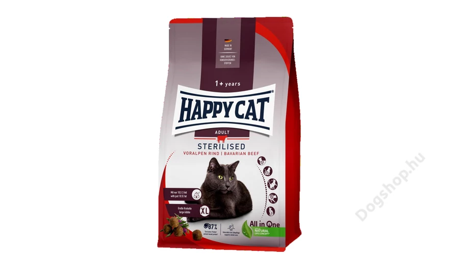 A Happy Cat Sterilised Voralpen-Rind összetétele kifejezetten az ivartalanított macskák táplálkozási igényeinek megfelelően került kialakításra. A laktató és ízletes tápszemek csupán 10,5% zsírt tartalmaznak, étkezés közben pedig tápláló alpesi marhával, finom rozmaringgal és máriatövissel nyújtanak változatosságot. A nagy tápszemek felépítése segíti a napi fogápolást.