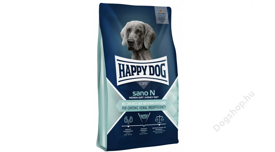 - A Happy Dog Care Sano N a krónikus veseelégtelenségben szenvedő kutyák veseműködésének támogatására szolgál.