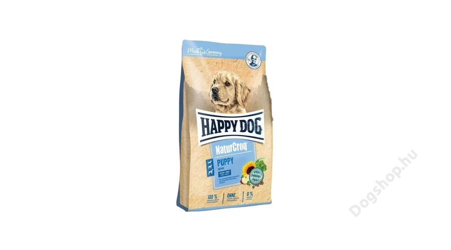 A Happy Dog NaturCroq welpen kiegyensúlyozott, könnyen emészthető, teljes értékű élelmezést biztosít a 4 hétnél idősebb kutyakölyköknek 1 éves korig. Az értékes állati fehérjék, a kiváló minőségű, Németországban termelt gabona, a szükséges ásványi anyagok, vitaminok és nyomelemek ideális feltételeket teremtenek az egészséges fejlődéshez.