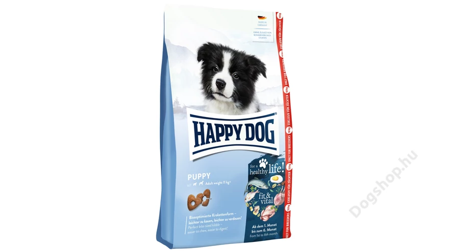 A Happy Dog Supreme Fit & Vital Puppy egy teljesértékű eledel normál energiaszükségletű közepes- és nagytestű kölyökkutyák számára 1 hónapostól 6 hónapos korig.