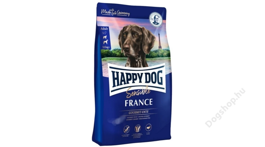 A Happy Dog Supreme Sensible France egy teljes értékékű állateledel 11 kg feletti normál energiaszükségletű közepes és nagytestű felnőtt kutyák számára. Gabonamentes receptúra, kacsával és értékes omega-3 és omega-6 zsírsavakkal a bőr és a bunda támogatására. Állatorvosok ajánlásával. Érzékeny gyomrú kutyáknak is ideális.