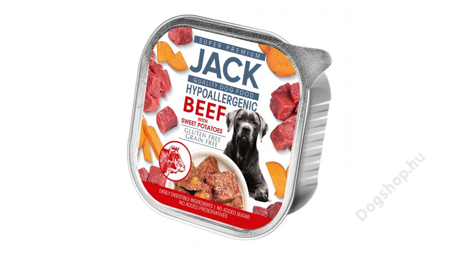 Jack Super Premium hipoallergén pástétom, marhahússal és édesburgonyával. Az összetevőket úgy válogattuk, hogy azok a legkevésbé legyenek allergének. Manapság egyre több kutya szenved allergiás tünetektől, mint például a rendellenes szőrhullás, a túlzott mancs-nyalogatás és vakarózás vagy a rendszeres híg széklet. Etetési tesztjeink alapján akár néhány hét alatt látható javulás tapasztalható. A pástétom elkészítésénél csak prémium alapanyagokat használnak, nem tartalmaz sem csontot, sem csontlisztet. Vitaminokban gazdag, teljes értékű eledel.