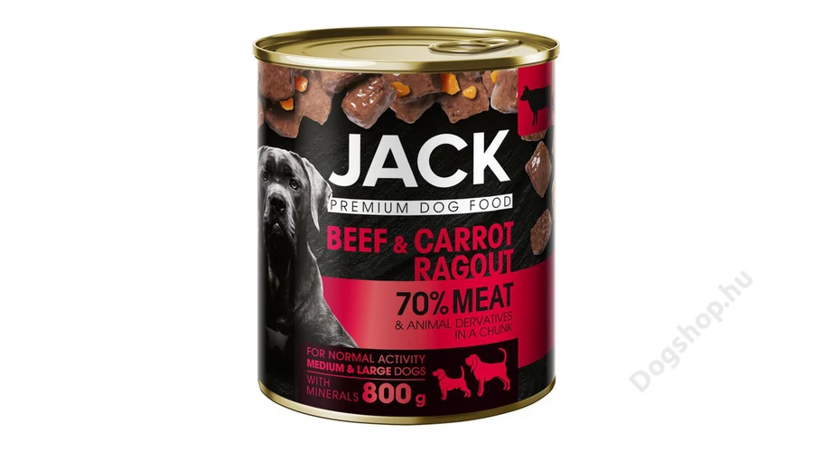 Jack Premium kutya konzerv ragu marha-répa egy teljes értékű és ínycsiklandó eledel kutyája számára, amely gazdag hús- és zöldségtartalmának köszönhetően biztosítja a kutyája egészséges táplálkozásához szükséges tápanyagokat. A 70%-os hús- és állati származékok, és a sárgarépa, mint tápláló zöldség kombinációja, gazdagítja kutyája étkezését, míg a tészta hozzájárul az egészséges szénhidrát-bevitelhez. A könnyen emészthető, ásványi anyagokban és vitaminokban gazdag eledel kutyája egészségét és vitalitását is támogatja.