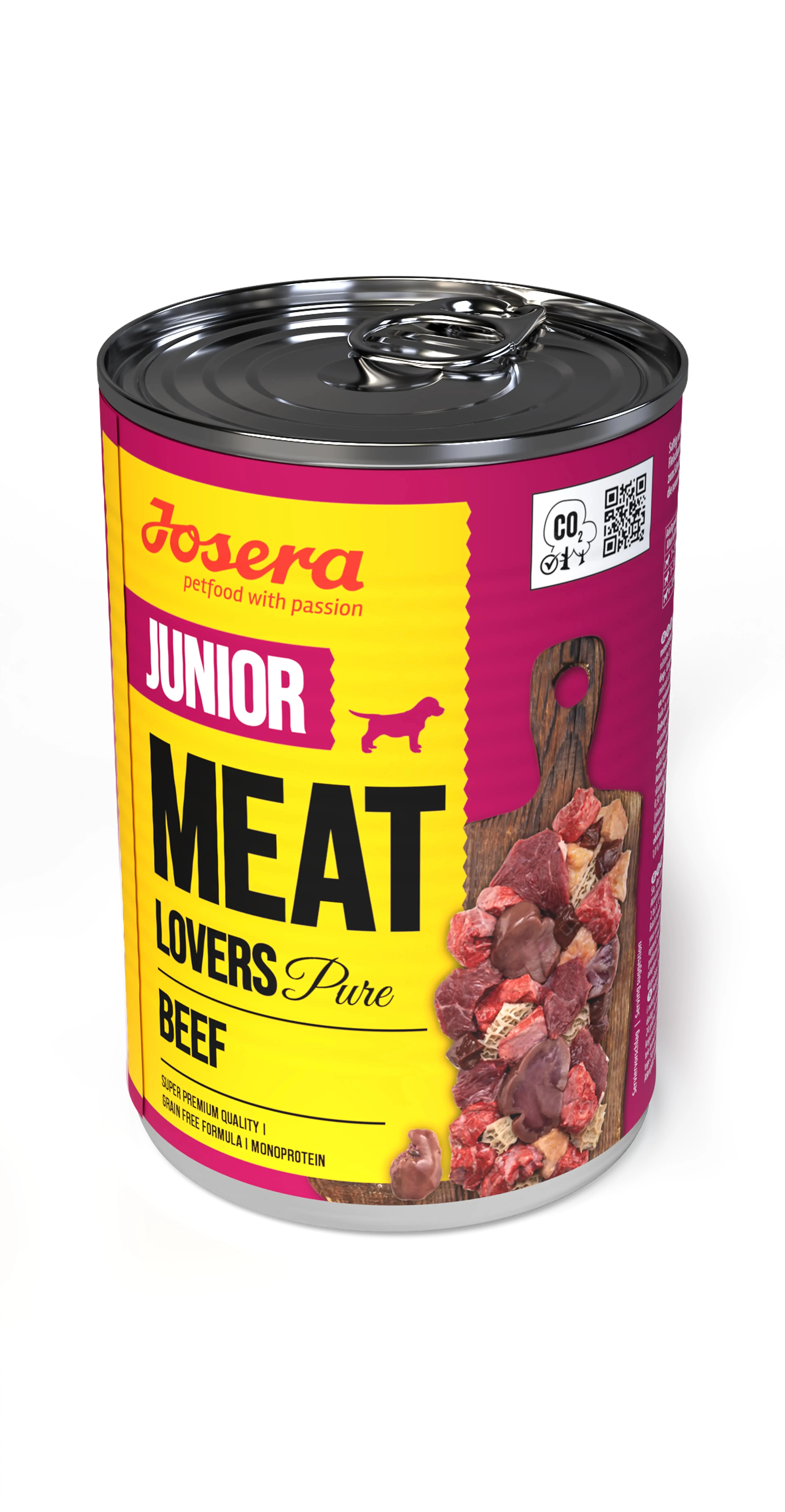 A Josera Meatlovers Junior Menu Beef egy teljes értékű, gabonamentes konzerves eledel marhával, mely minden méretű, fiatal kutyának alkalmas.