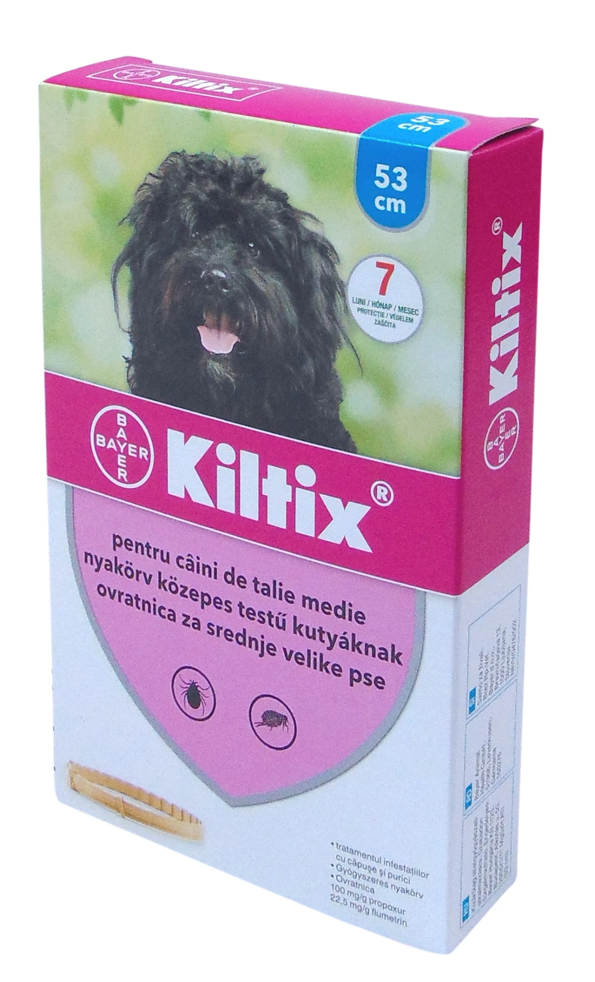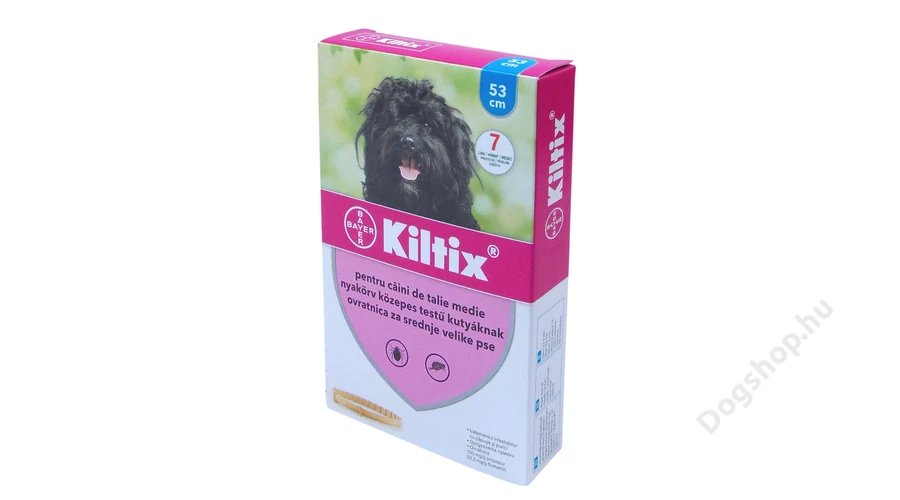 Kiltix kullancs- és bolhanyakörv kutyák részére. A nyakörv két hatóanyaga különlegesen hosszú, akár 7 hónapig tartó védelmet biztosít kutyájának a kullancsok és bolhák ellen.
