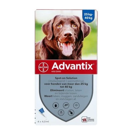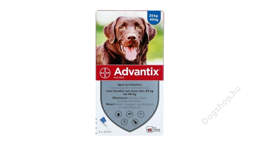 - Advantix Spot On 25 kg feletti kutyáknak A.U.V. : Tubus: 4,0 ml; Imidakloprid: 400 mg; Permetrin: 2000 mg; E321: 4,0 mg