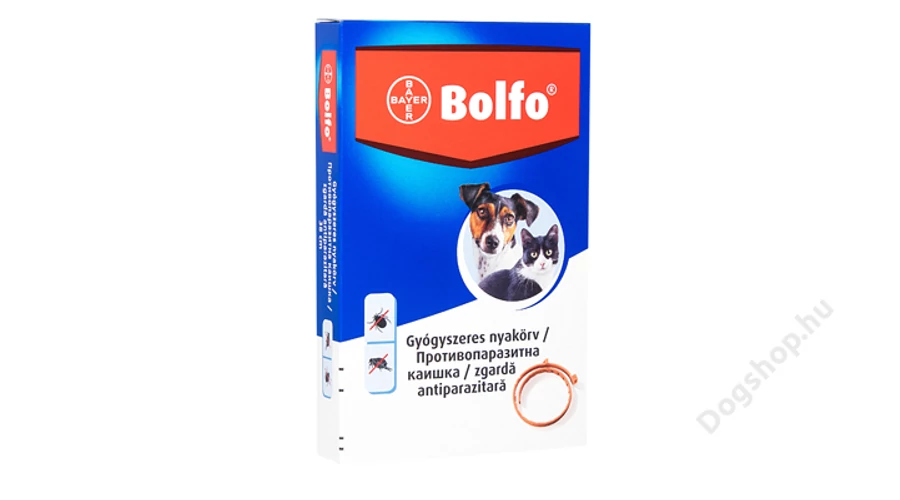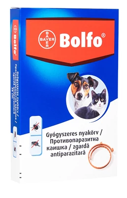 Bolfo bolha és kullancsirtó nyakörv kutyák és macskák részére. A nyakörv bolhák ellen 4 hónapig hatékony, a kullancsok elleni hatás 10 hétig tart.