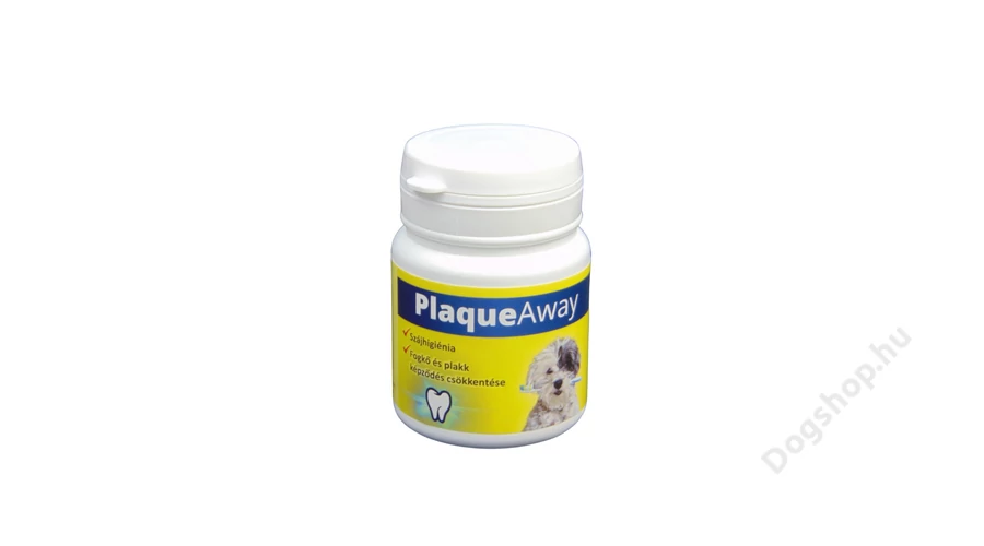 A PLaque-away plakkeltávolítót a kutya megemészti, hatóanyagai pedig a véráram útján a nyálmirigyekbe kerülnek, majd onnan a kutya nyálába. A szulfonát-fruktóz nevű hatóanyag napi 24 órában jelen van a nyálban és antibakteriális tulajdonságai csökkentik a plakk képződést. A plakkok nem láthatóak, de 4-8 héttel később láthatjuk a barna fogkőlerakódást csökkenését, ami megerősíti, hogy működik a készítmény.
