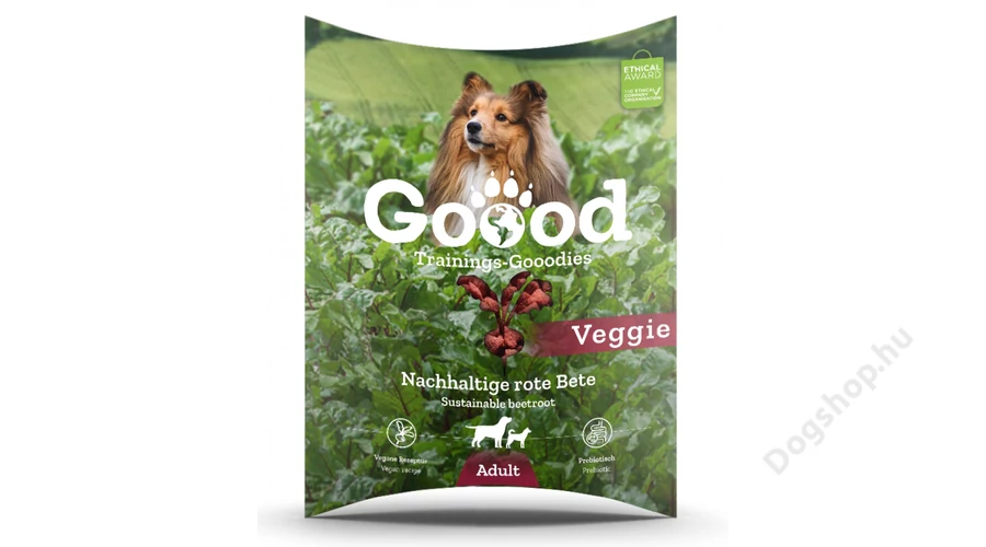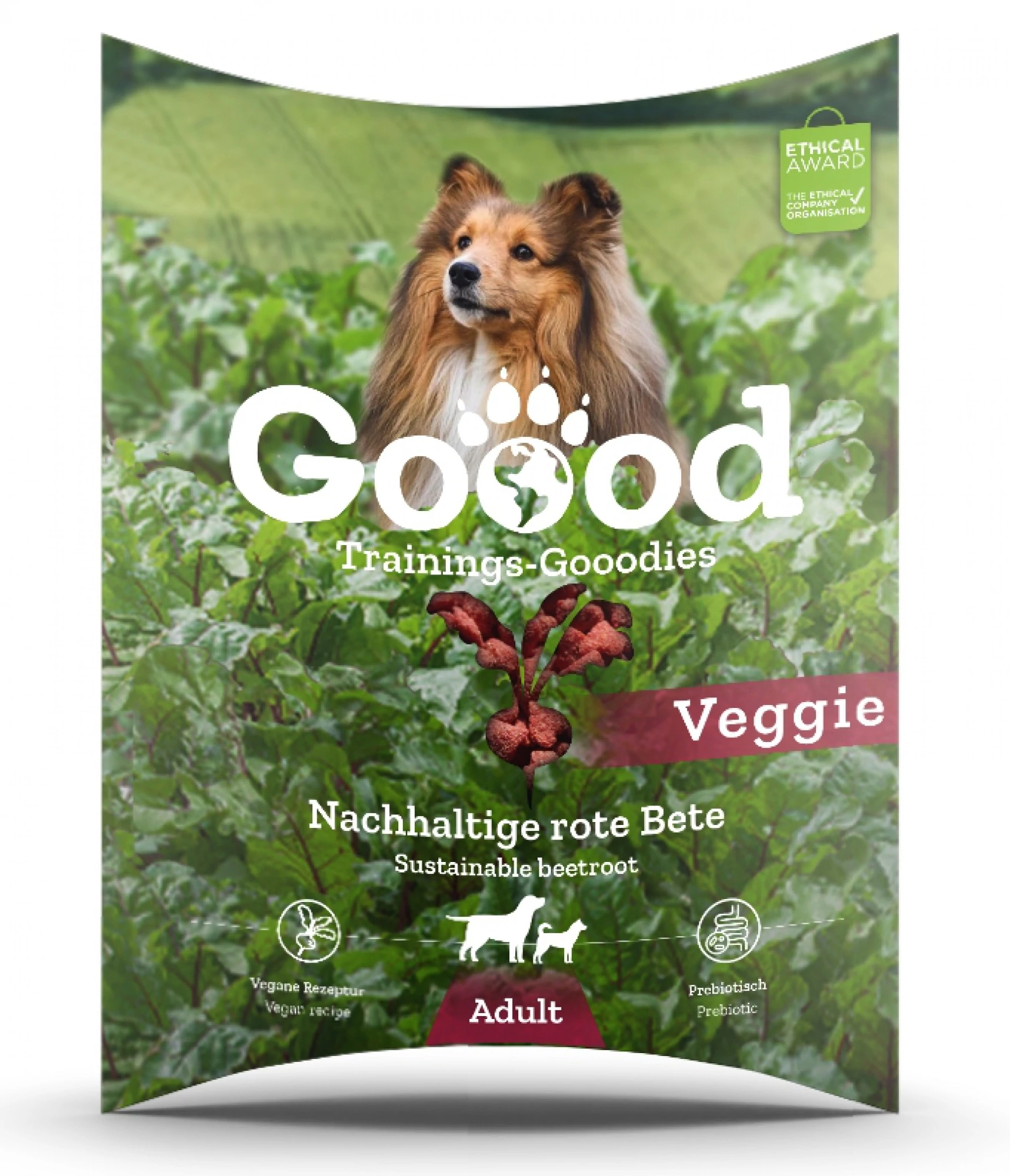 A Goood Training Gooodies Adult - Veggie Sustainable Beetroot egy ropogós és búzamentes jutalomfalat fenntartható répából készült kutyák tréningje számára.