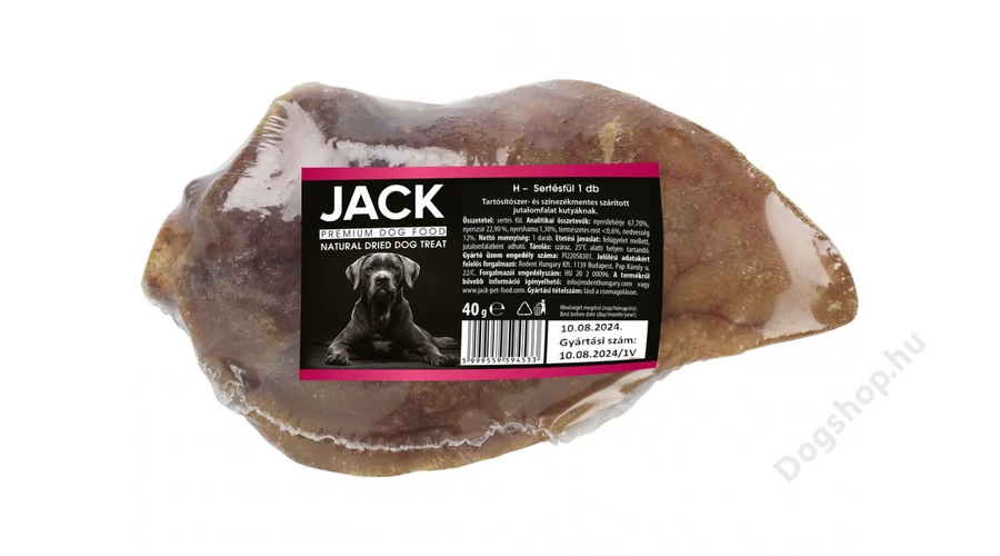 Jack sertésfül egy bükkfán füstölt, szárított jutalomfalat. Nagy népszerűségnek örvend a kutyák és gazdájuk körében. Magas porctartalma erősíti a rágóizmokat, és tisztítja a fogakat. Minden kutya számára tökéletes rágcsálnivaló, és ideális időtöltés. Napi fogyasztása ajánlott az étkezések között.