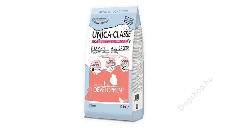 A Gheda Unica Classe Puppy All Breeds Development egy olasz, teljes értékű, csirke ízesítésű szárazeledel közepes és nagytestű kölyök kutya táplálására.