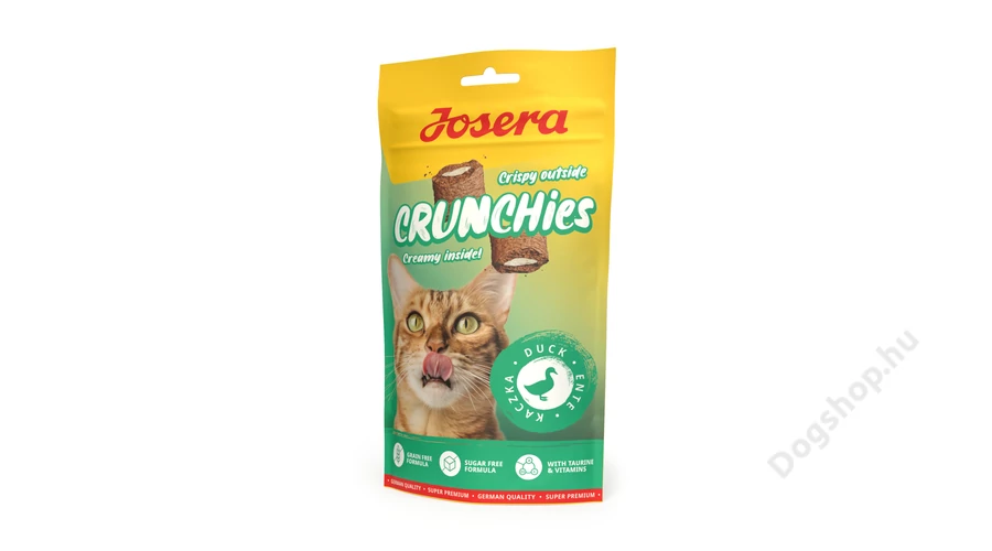 A Josera Crunchies Duck egy ropogós, gluténmentes csemege jutalomfalat kacsával és krémes töltelékkel macskáknak.