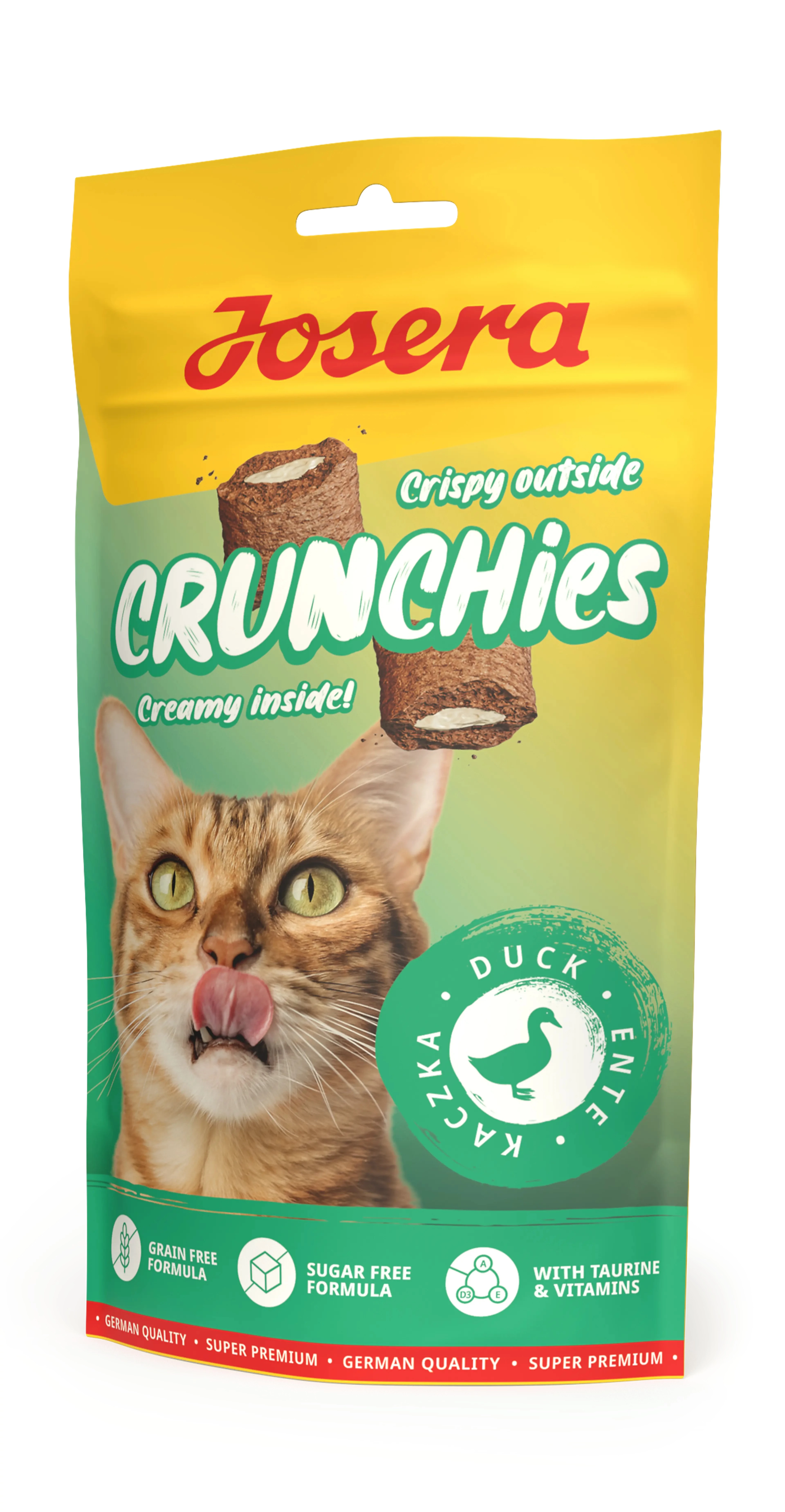 Ne ijedjen meg, amit hall az a Josera Crunchies Duck ropogása, amelyet a macska rendkívüli élvezettel majszol! A ropogós bevonat krémes tölteléket rejt - és ellenállhatatlanul finom kacsával kényezteti a bársonytalpút! A gabonamentes és kalóriaszegény receptúrának köszönhetően mindennap bűntudat nélkül adhható nassolnivaló. Értékes vitaminokat és taurint, valamint szőrgombócképződés elleni kompplexet tartalmaz - és persze nincsenek benne olyan felesleges összetevők, mint például a cukor, szója, tej, színezékek és tartósítószerek.