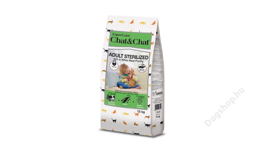 A Gheda Chat&Chat Adult Sterilized egy teljes értékű száraztáp szárnyassal, borsóval és teljes kiörlésű gabonával felnőtt, ivartalanított macskák számára.