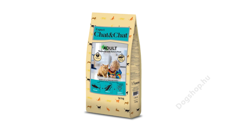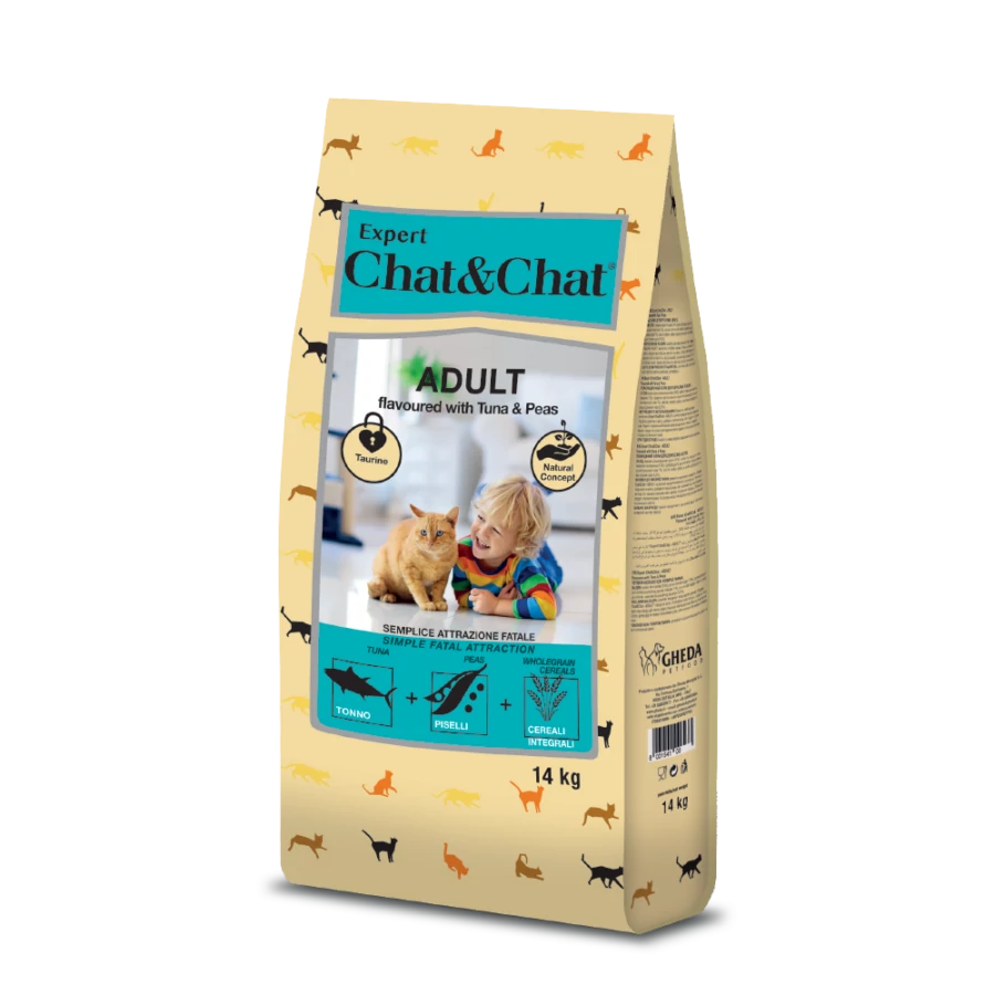 A Gheda Chat&Chat Adult Tuna & Peas egy teljes értékű száraztáp tonhallal, borsóval és teljes kiörlésű gabonával felnőtt macskák számára.