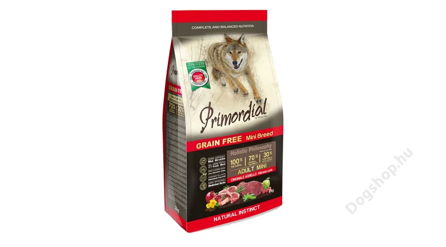 A Primordial Grain Free tápok válogatott természetes összetevőkből készült teljes értékű és kiegyensúlyozott eledel kutyák számára. Körülbelül 35% friss húst tartalmaz, gabonát nem tartalmaz, ideális érzékeny gyomrú kutyáknak, valamint gabonaintoleranciában vagy allergiában szenvedőknek. Fehérjéi könnyen emészthetők és magas biológiai értékűek, így a kutya erős és egészséges marad.