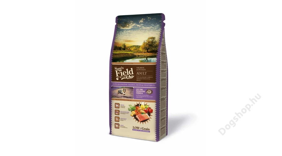 A Sam's Field lazac & burgonya Adult egy teljesértékű állateledel, valamennyi fajtájú felnőtt kutya számára.