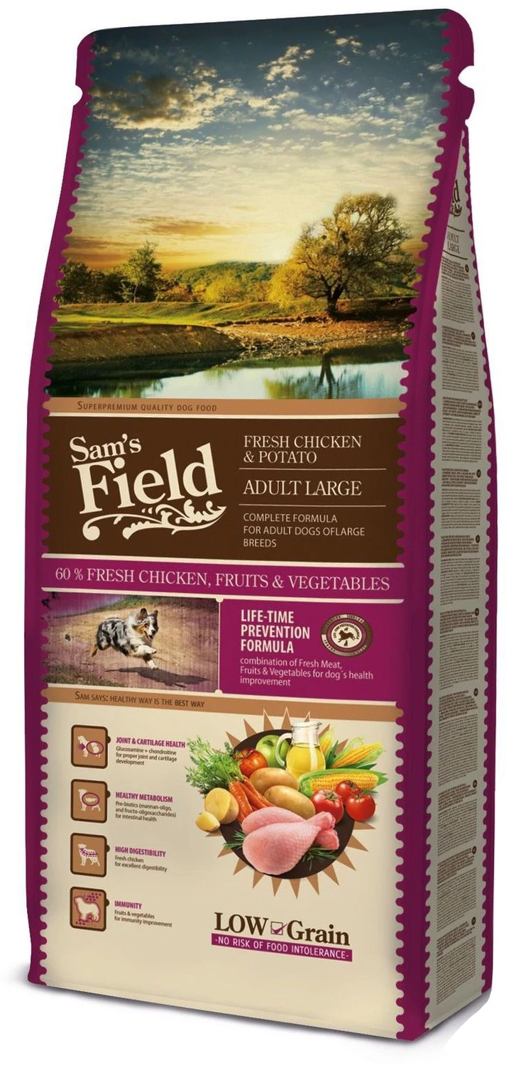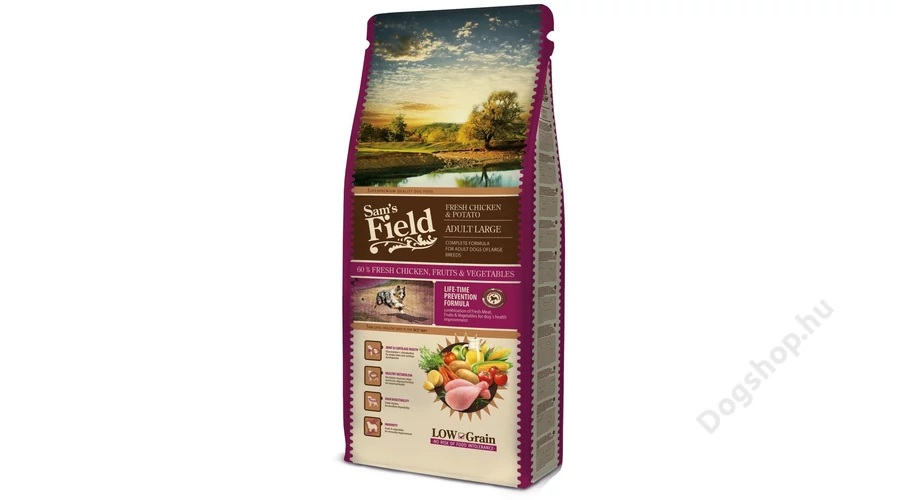 A Sam's Field Fresh Adult Large csirke és burgonya egy teljesértékű állateledel nagytestű, felnőtt kutyák számára.