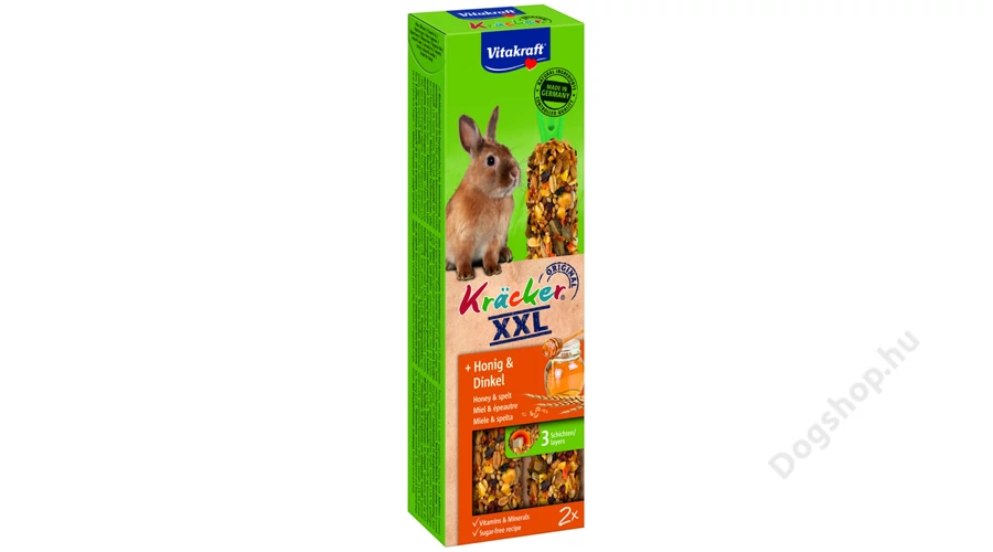 A Vitakraft dupla rúd mézzel és tönköllyel nyulaknak egy háromszor sütött, cukormentes, vitaminokban gazdag kiegészítő táplálék törpenyulak számára. Kedvencét arra készteti, hogy megdolgozzon a táplálékáért - mint a természetben.