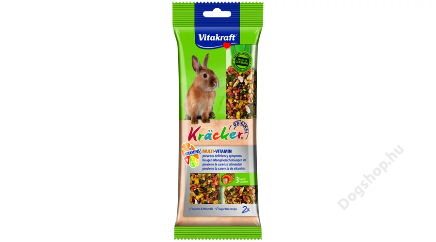 A Vitakraft dupla rúd multivitaminnal nyulaknak egy háromszor sütött vitaminokban és ásványi anyagokban gazdag kiegészítő eleség extra vitaminnal, cukormentes recept alapján nyulak számára.